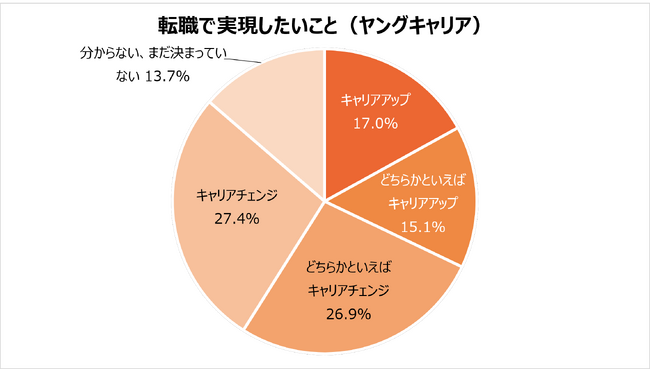 転職において、「キャリアアップ」よりも、経験業種・職種とは異なる仕事に挑戦する「キャリアチェンジ」を希望する20代が多いことが明らかになりました。社会人経験3年以上の「ヤングキャリア」は、54.3%が「キャリアチェンジ」を希望。約半数は、経験業種・職種と異なる仕事への挑戦を希望していることが分かります。「キャリアアップ」を希望する割合は、32.1%でした。