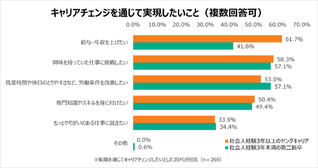 経験業種・職種と異なる仕事に挑戦する「キャリアチェンジ」を通じて実現したいことは、社会人経験3年以上の「ヤングキャリア」と、社会人経験3年未満の「第二新卒」で異なる結果となりました。ヤングキャリアは、「給与・年収を上げたい」が61.7%で最多。次いで、「興味を持っていた仕事に挑戦したい」58.3%が続きました。関心のある仕事に挑戦する他、業種や職種を変えることで年収を上げたいという意向がうかがえます。一方、第二新卒は「興味を持っていた仕事に挑戦したい」、「残業時間や休日のとりやすさなど、労働条件を改善したい」が、同割合の57.1%で最多となっています。