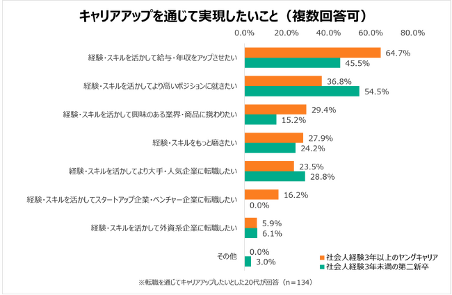 社会人経験3年以上の「ヤングキャリア」が、キャリアアップを通じて実現したいことは「給与・年収をアップさせたい」が64.7%で最多。次いで、「より高いポジションにつきたい」36.8%、「興味のある業界・商品に携わりたい」29.4%が続きました。一方、社会人経験3年未満の「第二新卒」が、キャリアアップを通じて実現したいことは「より高いポジションに就きたい」が54.5%で最多。次いで、「給与・年収をアップさせたい」45.5%、「大手・人気企業に転職したい」28.8%が続きました。