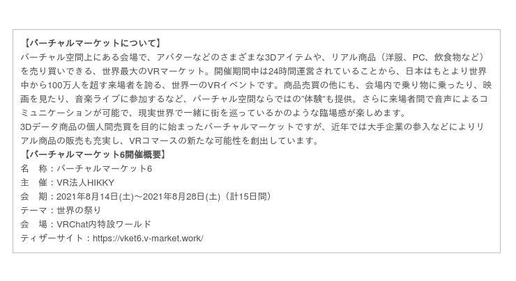 今回は、バーチャル空間内のユーザーコミュニケーションを促す上記サービスの提供やECサイトの商品展開の大幅拡大を行うことから、前回の来場者の倍増を見込んでいます。