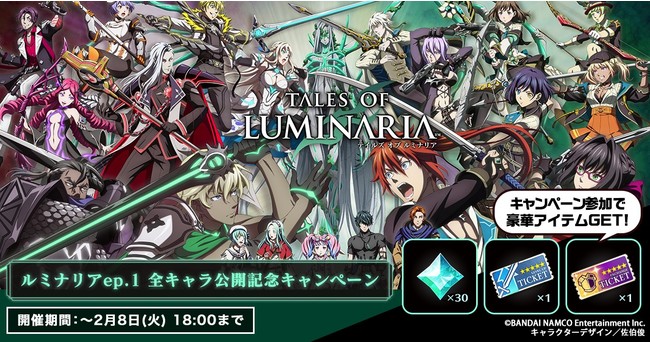 株式会社コロプラ(代表取締役社長:宮本貴志、本社:東京都港区、以下「コロプラ」)は、株式会社バンダイナムコエンターテインメント(代表取締役社長:宮河恭夫、本社:東京都港区)と共同開発による「テイルズ オブ ルミナリア」(以下、「ルミナリア」)において、本日2022年2月4日(金)より、「ルミナリアep.1 全キャラ公開記念キャンペーン」を開催することをお知らせします。