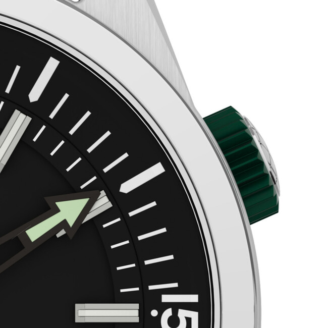 立体的な「アプライドインデックス」は蓄光塗料を完備。秒針と2時位置のリューズの、落ち着いたグリーンのアクセントカラーが華を添えます。100m防水。