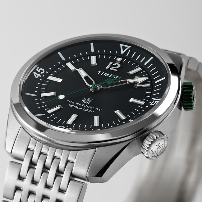 文字盤とリューズにはTIMEXの創業当時の社名だった「WATERBURY CLOCK COMPANY」のロゴを配置。秒針の根元には「W」の文字を模っています。随所に施したディティールが、TIMEXの170年弱に渡る時計製造の歴史を感じさせます。