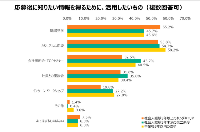 応募後に知りたい情報を得るために活用したいものについて、社会人経験3年以上のヤングキャリアでは「職場見学」55.2%が最多となりました。次いで、「カジュアルな面談」53.8%、「会社説明会・TOPセミナー」32.5%が続きます。第二新卒は、「カジュアルな面談」54.7%が最多。次いで「職場見学」45.7%、「会社説明会・TOPセミナー」43.7%が続きました。卒業後3年以内の「既卒」も、「カジュアルな面談」58.2%、「職場見学」45.6%、「会社説明会・TOPセミナー」40.5%の順で回答を集めています。