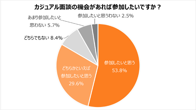 カジュアル面談について、機会があれば「参加したいと思う」と回答した20代が53.8%に上りました。「どちらかといえば参加したいと思う」29.6%を合わせると、8割超の20代がカジュアル面談の参加を希望していることが分かります。