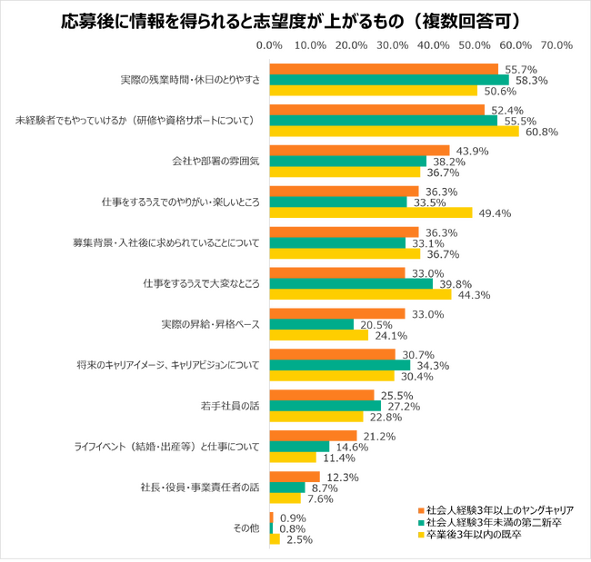 応募後に情報を得られると志望度が上がるものは、社会人経験3年以上の「ヤングキャリア」、社会人経験3年未満の「第二新卒」共に、「実際の残業時間・休日のとりやすさ」が最多となりました。ヤングキャリアは、次いで「未経験でもやっていけるか(研修や資格サポートについて)」、「会社や部署の雰囲気」が続きました。第二新卒は、次いで「未経験でもやっていけるか(研修や資格サポートについて)」、「仕事をするうえで大変なところ」と続いており、大変な面も含めてリアルな情報を得たいという意向がうかがえます。卒業後3年以内の「既卒」は、「未経験でもやっていけるか(研修や資格サポートについて)」の回答が最多。次いで、「実際の残業時間・休日のとりやすさ」、「仕事をするうえでのやりがい・楽しいところ」の順に続きました。