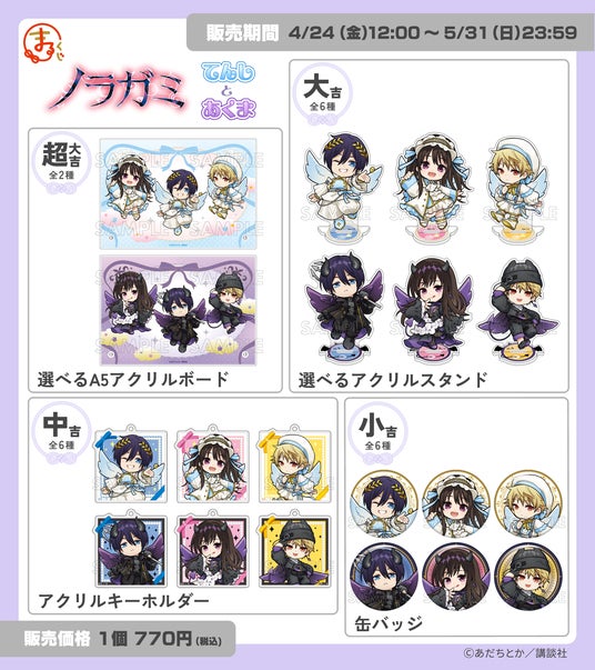 今回のまるくじ『ノラガミ』てんしとあくまでは、「天使」と「悪魔」がテーマのとても可愛らしい描き起こしちびキャライラストを使用した、オリジナルグッズをご用意しました! 各賞の商品といたしましては、A5アクリルボード、アクリルスタンド、アクリルキーホルダーなど、ファンの皆様に喜んでいただけるラインナップとなっております。 是非、この機会にお買い求めください!