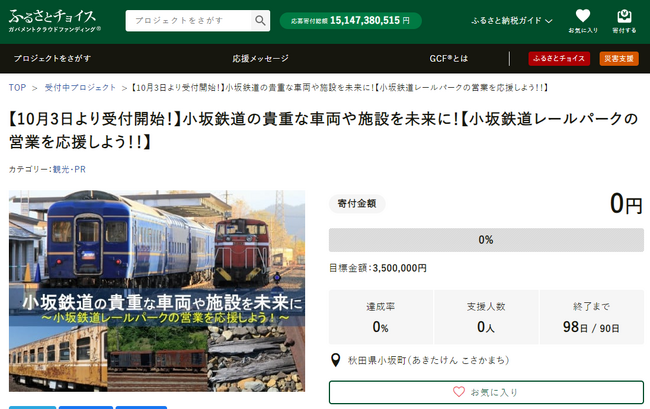 秋田県小坂町(町長:細越満、以下「小坂町」)と国内最大級のふるさと納税総合サイト「ふるさとチョイス」( https://www.furusato-tax.jp/ )を企画・運営する、株式会社トラストバンク(本社:東京都渋谷区、代表取締役:川村憲一、以下「トラストバンク」)は、10月3日正午よりトラストバンクが提供する、ふるさと納税制度を通じてクラウドファンディング型で寄付を募る仕組み「ガバメントクラウドファンディング(R)」(以下「GCF(R)」)で、小坂鉄道レールパークの貴重な車両や施設の保全維持を目的としたプロジェクトを開始します。募集期間は10月3日~12月31日で、目標寄付金額は350万円です。