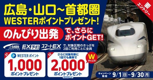 2024年9月1日(日)~9月30日(月)の期間中、e5489またはEXサービス(エクスプレス予約・スマートEX)で、対象区間を2回以上ご利用いただいた方を対象に、もれなく2回利用(※)につきWESTERポイントを1,000ポイントプレゼントするキャンペーンを開催いたします。