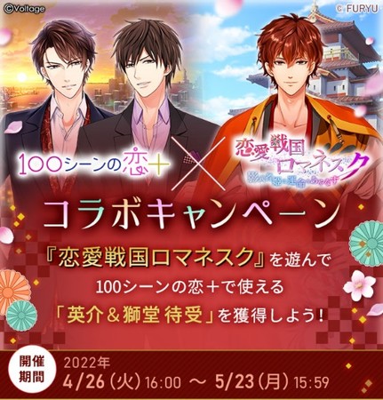 株式会社ボルテージ(本社:東京都渋谷区 代表取締役:津谷 祐司)は、提供中のボル恋タイトル「100シーンの恋+」 (以下、「100恋+」)がフリュー株式会社(本社:東京都渋谷区、代表取締役社長:三嶋 隆)の運営する恋愛シミュレーションゲーム「恋愛戦国ロマネスク~影武者姫は運命をあやなす~」(以下、「恋愛戦国ロマネスク」)との期間限定コラボキャンペーンを、4月26日(火)より実施することをお知らせいたします。