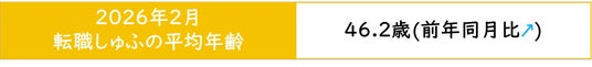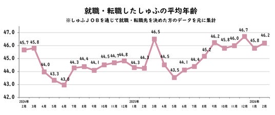 転職しゅふの平均年齢は46.2歳となり、前月比+0.4歳、前年同月比+1.9歳となりました。
