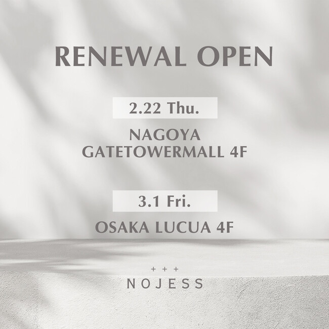 いつもノジェスをご愛顧いただき誠にありがとうございます。この度、2月22日(木)にノジェス 名古屋ゲートタワーモール、3月1日(金)にノジェス 大阪ルクアがリニューアルオープンいたします。リニューアルを記念して、限定商品やノベルティをご用意しております。