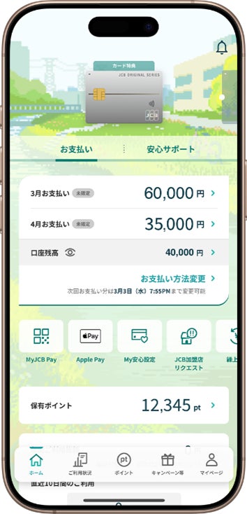 ID・パスワード入力の要らない簡単ログイン、直近のカードご利用状況をグラフで表示、もしもの時に安心な不正使用検知に関するPUSH通知など、MyJCBアプリならではの機能があり、さらに便利に利用できます。