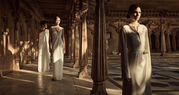 ディオールは、インドが誇る多様な職人技を体現する2023年フォール コレクションのシルエットが、光と影の魅惑的な相互作用によって際立つ、ポエティックで力強いキャンペーンビジュアルを発表しました。ラジャスタンの至宝と呼ばれるウダイプールの街の中心で、現地の宮殿や寺院の壮麗な美しさを反映した、夢のような装飾のなかでルックを撮影。インドの伝統的な衣装の技法が、シルクのきらめく色調の一連のルックで表現され、ミニマルなラインが引き立つモノクロームのロングチュニックは、黒と白のグラフィックの純粋さを強調しています。大胆なプリントで描かれたインドの風景やモチーフは、刺繍によってドレスやトップス、メゾンのアイコンである「ディオール ブックトート」バッグにあしらわれ、これらの卓越した職人技や豊かなテキスタイルの伝統へ捧げる、マリア・グラツィア・キウリの情熱を物語ります。これは、1947年に初めて開催されたショーから続く、メゾン ディオールと尽きることのないインスピレーション源となるインドとの間に紡がれた情熱的な絆を永続させる、魅惑的な旅です。