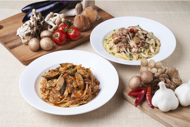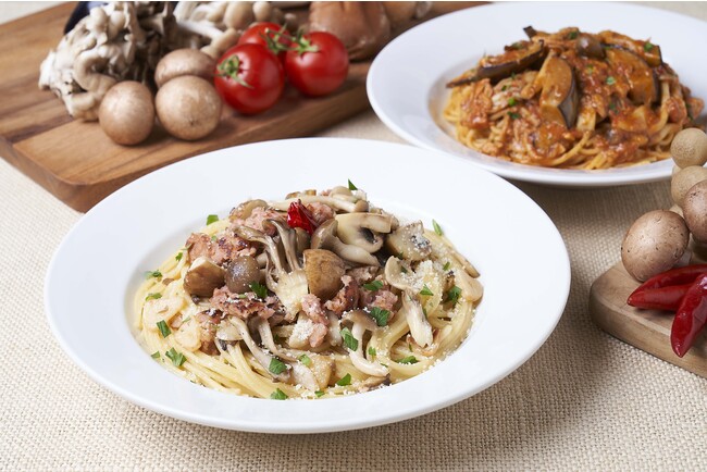 第3期となる9月13日(火)から11月20日(日)までの期間は、秋のおすすめメニューとして、キノコに相性のよいツナと揚げ茄子を合わせたコクのある「秋ナスとキノコのトマトソース木こり風」と、キノコ各種と大豆ミートを使用してヘルシー&栄養満点に仕上げた「大豆ミートといろいろキノコのペペロンチーノ」のスパゲティ2品を販売します。