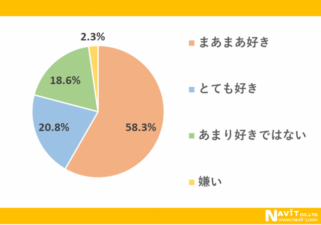 「かき氷は好きですか?」の質問については、「まあまあ好き」が58.3%、「とても好き」が20.8%、「あまり好きではない」が18.6%という順になり、「まあまあ好き」「とても好き」を合わせると79.1%の人が、かき氷を好きということが分かりました。