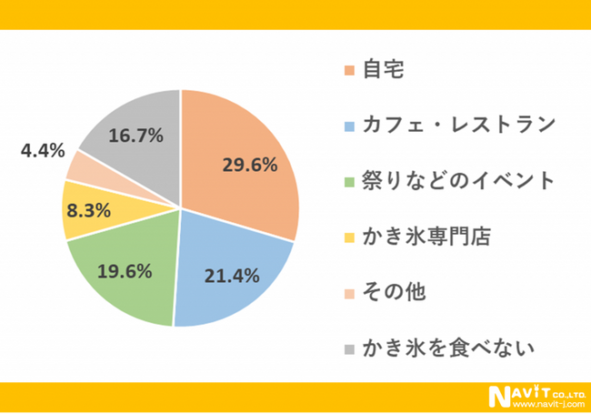 「かき氷を最もよく食べる場所はどこですか?」という質問については、「自宅」が29.6%、「カフェ・レストラン」が21.4%、「祭りなどのイベント」が19.6%という順になりました。