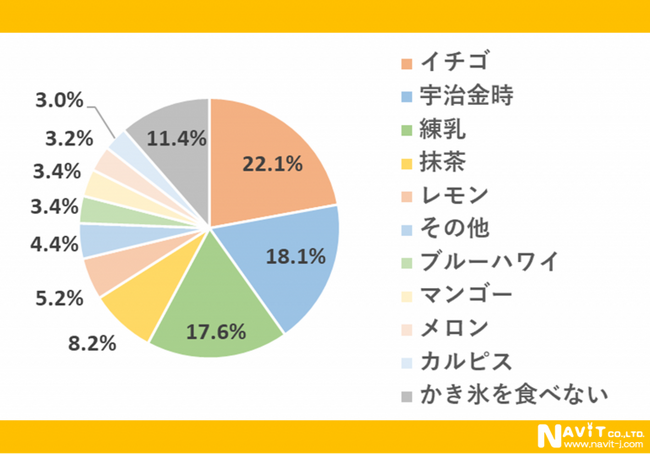 「最も好きなかき氷の味は何ですか?」という質問については、「イチゴ」が22.1%、「宇治金時」が18.1%、「練乳」が17.6%という順になりました。