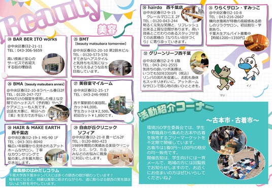 本冊子では、西千葉マロニエ商店会に加盟する飲食店をはじめ、生活関連店舗、美容、医療、教育施設など、幅広いジャンルの店舗情報を掲載しています。「知っているようで知らなかった西千葉」を再発見できる内容となっているほか、環境ISO学生委員会の環境活動の紹介や、エコ工作コラム、エコクロスワードなども盛り込んでいます。
