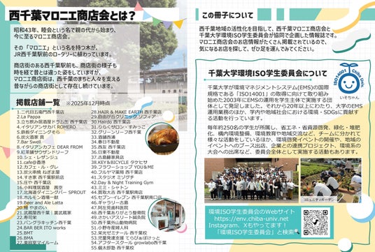 千葉大学環境ISO学生委員会は、西千葉マロニエ商店会と協力し、西千葉地域の活性化を目的とした情報冊子を制作しました。千葉大生をはじめとする地域の方々に商店会のお店を紹介し、地域の魅力を改めて発信することを目的としています。