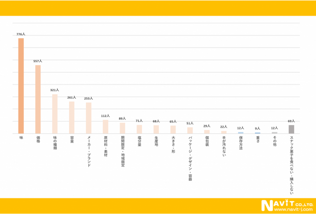 「スナック菓子を購入する際、重要視する点は何ですか?」という質問を複数選択可能で行ったところ、「味」が27.9%、「価格」が20.1%、「味の種類」が11.6%という順になりました。