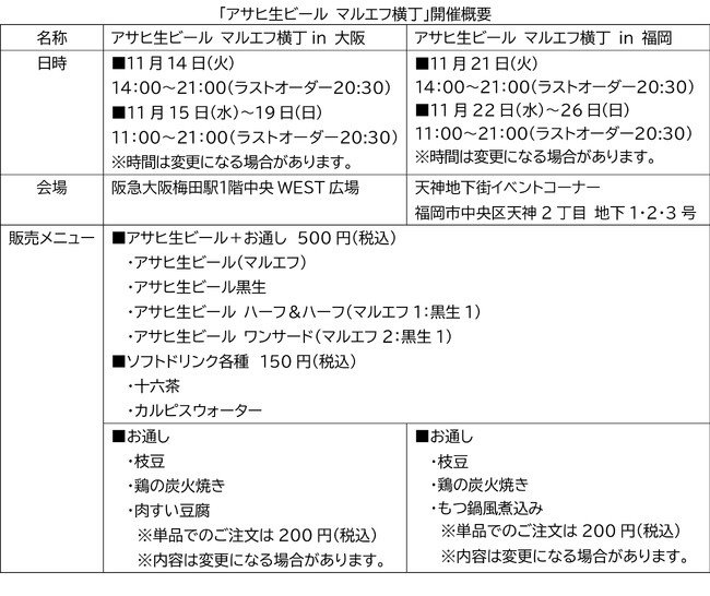 アサヒビール株式会社(本社 東京、社長 松山一雄)は“マルエフ”の愛称で飲食店やファンの方に愛され続ける『アサヒ生ビール』の“まろやかなうまみ”や“ぬくもりのある世界観”が楽しめる期間限定イベント「アサヒ生ビール マルエフ横丁」を11月14日から11月19日まで阪急大阪梅田駅1階中央WEST広場(大阪府大阪市)で、11月21日から11月26日までの天神地下街イベントスペース(福岡県福岡市)で開催します。