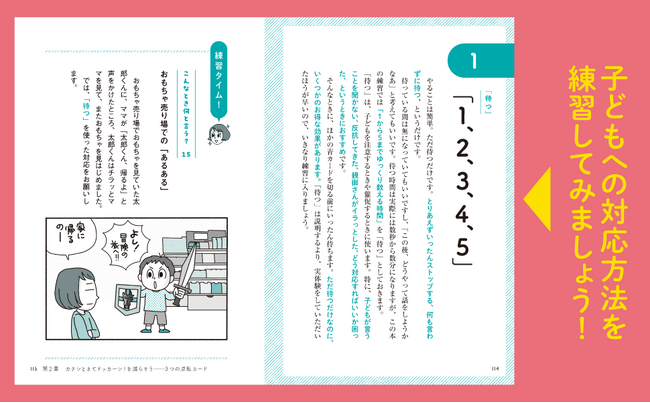 本書のテーマは、「子どもの問題行動にカチンときてドッカーンとなりそうな状況からの逆転!」。数ある子どもへの基本的な対応方法のうち、「教える」「ほめる」「考えさせる」「激怒しかけたところで、どうにか親側の対応を切り替える」ということを、楽しく練習して身につけるお手伝いをします。