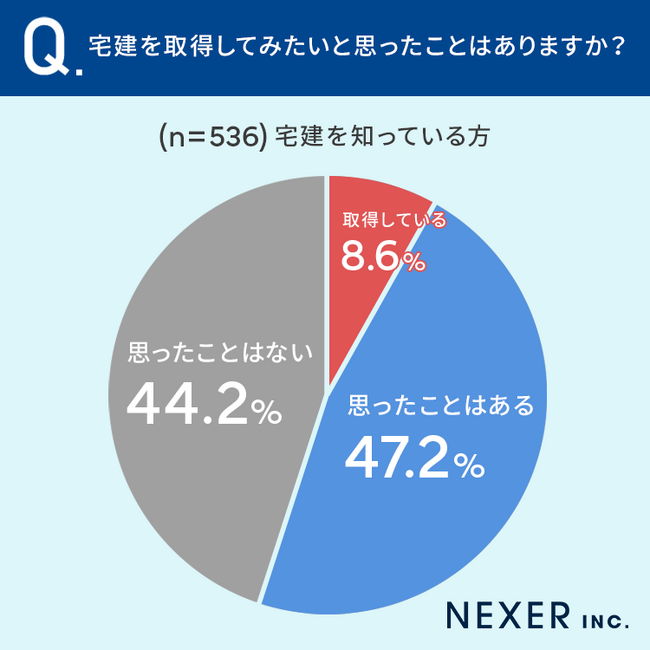 47.2%の方が「宅建」を取得してみたいと思ったことがあると回答しており、8.6%の方は既に宅建を取得していると答えていました。