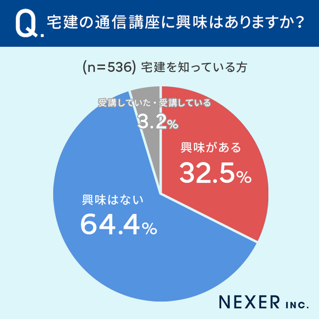32.5%の方が「宅建の通信講座に興味がある」と回答しており、3.2%の方に関しては「受講していた・受講している」と答えています。
