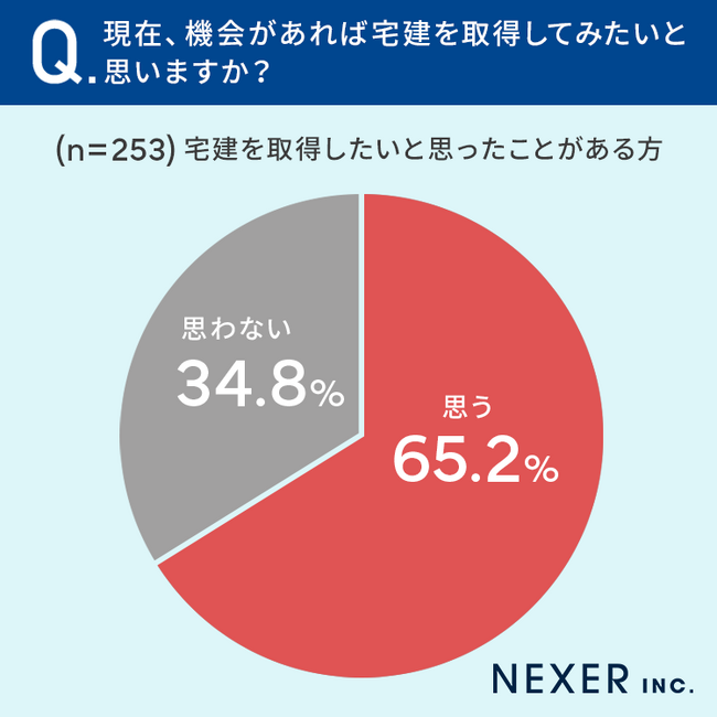 65.2%の方が「宅建を取得してみたいと思う」と回答しており、その理由として「色々と役立ちそう」や「視野や知識、職業が広がりそう」などが多く挙げられていました。