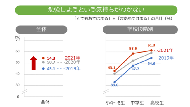 ベネッセの社内シンクタンク・ベネッセ教育総合研究所が東京大学社会科学研究所との共同研究プロジェクトで行った調査「子どもの生活と学びに関する親子調査2021」では、「勉強する気持ちがわかない」の肯定率が調査対象全体の小4~高校生において2019年の45.1%から2021年には54.3%に増加、さらに小4~6生においても33.0%から43.1に増加するなど、子どもたちの学習意欲が低下する傾向が明らかになりました。