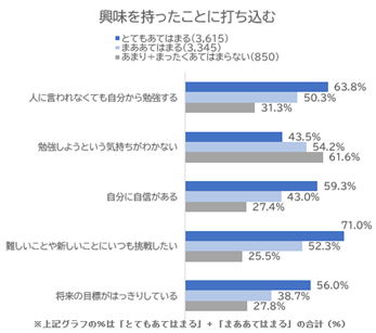 こうした子どもの学びへの意欲の課題に対して、上記調査のデータをさらに分析したところ、「興味を持ったことに打ち込む」と自認する子どもほど、「勉強しようという気持ちがわかない」比率が低いほか、「人に言われなくても勉強する」「難しいことや新しいことにいつも挑戦したい」「将来の目標がはっきりしている」等の肯定率が高い傾向も見られました。