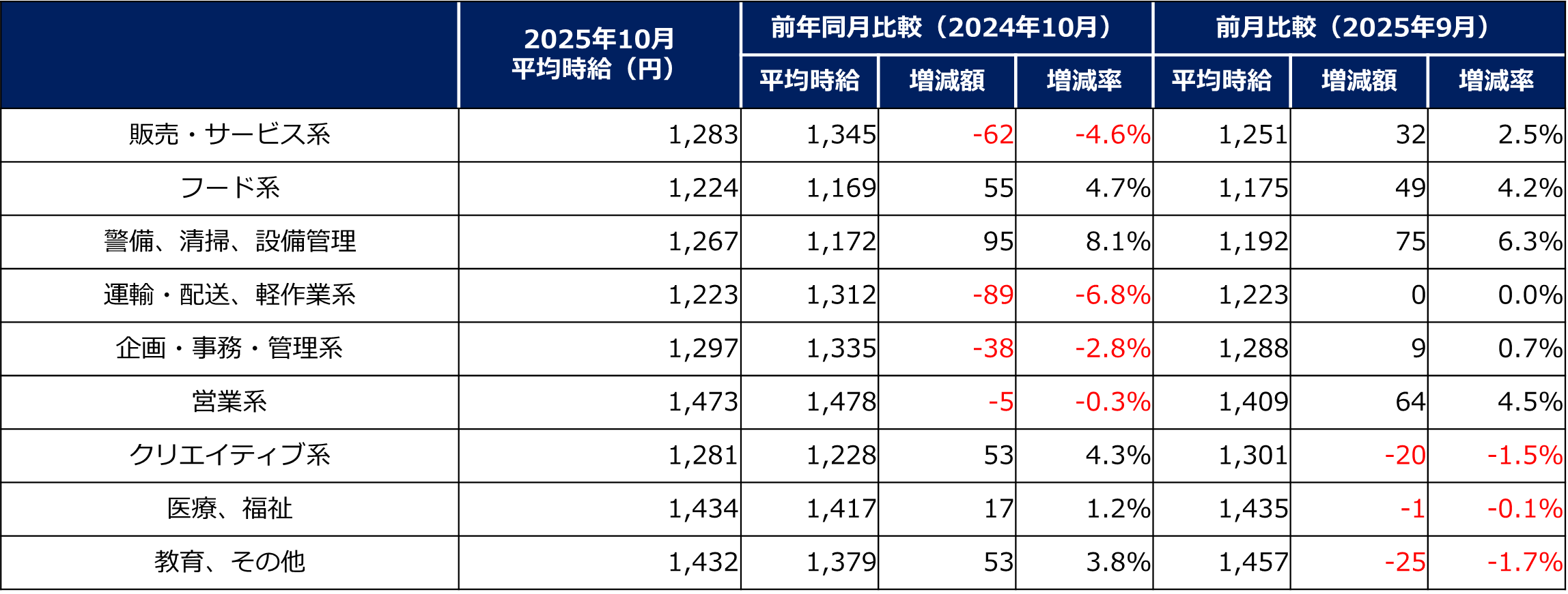 - 職種別では「警備、清掃、設備管理」で、前年同月比+95円の大幅上昇。