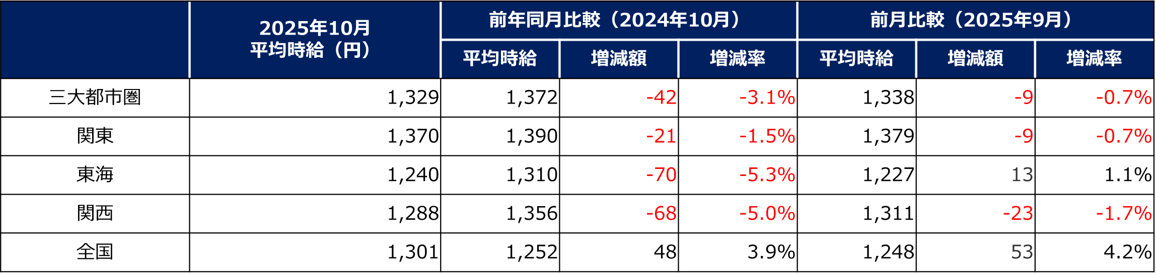 - 全国平均時給、前年同月・前月比でプラスに。三大都市圏はいずれもマイナス。