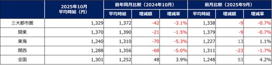 10月度のエリア別平均アルバイト時給は、三大都市圏全エリアで前年同月を下回る。