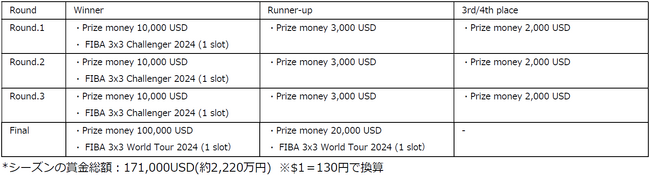 Round.1~3の各優勝チームには賞金10,000USDと、国際バスケットボール連盟主催のクラブチーム世界一決定戦FIBA 3x3 World Tourの予選大会である「FIBA 3x3 Challenger」の出場権利が与えられます。