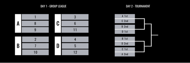 DAY1|12チームが、3チーム×4グループに分かれて総当りのグループリーグ戦を実施(12試合)
