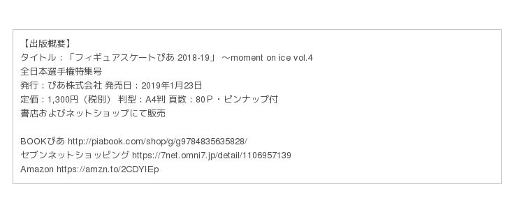 本日1月29日、ぴあ株式会社より『フィギュアスケートぴあ 2018-19 ~moment on ice vol.4 全日本選手権特集号』が発売となりました。