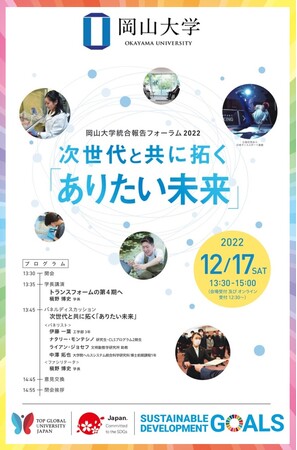 今回、統合報告書2022の発行に伴い、学内外のステークホルダーの皆様と対話を進めるため、「岡山大学統合報告フォーラム2022」を、2022年12月17日(土)に現地とオンラインのハイブリッドで開催いたします。