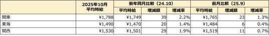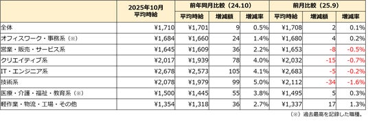 2025年10月度の三大都市圏平均時給は1,710円(前月比+2円・0.1%増、前年同月比+9円・0.5%増)で、過去最高時給を更新。前年同月を上回るのは38ヵ月連続です。