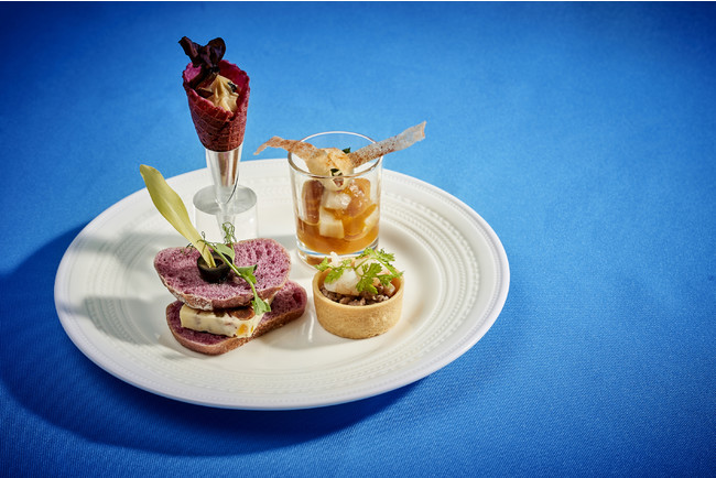セイヴォリーにも「トリュフ風味のクリームチーズ 舞茸 炭塩 ビーツコーン」、「ドライフルーツとナッツのチーズテリーヌ バルサミコ 赤ワインブレッド」、「帆立貝 南瓜のピュレ 魚介のスープ仕立て」など、ラグジュアリーブランドにふさわしく、かつ季節を取り入れた食材を用いています。