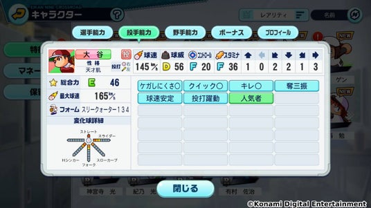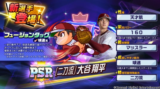 1.5周年を記念したログインボーナスやチャレンジイベントなどでは豪華なゲーム内アイテムが獲得できるほか、KONAMI野球ゲームアンバサダーの大谷翔平選手が二刀流として登場するスカウトも開催します。今回の大谷選手は、新ボーナス フュージョンタッグ「球速系」や、修得可能特殊能力として、「二刀流」を持っています。