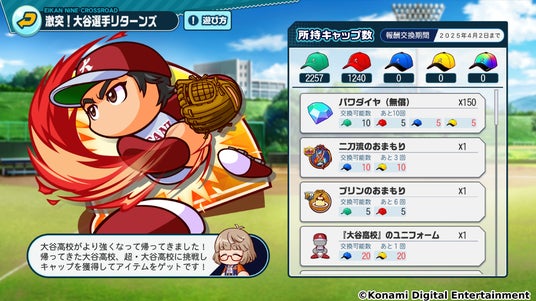 出現します。集めたキャップは、「キャップ交換所」で大谷高校のユニフォームなどの
