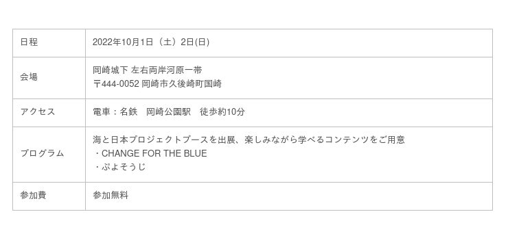 海と日本プロジェクトin愛知県実行委員会は、2022年10月1日(土)2日(日)に第9回あいちめし(R)︎ 岡崎城大合戦!で海と日本プロジェクトブースを出展いたします。この取組みは、日本財団が推進する海洋ごみ対策プロジェクト「海と日本プロジェクト・CHANGE FOR THE BLUE」の一環で開催するものです。
