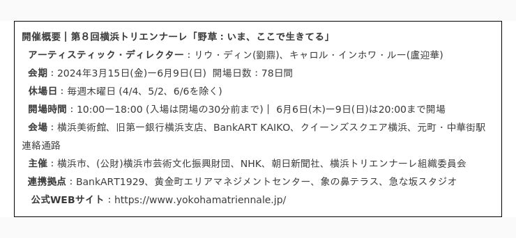 [時間]10:00-16:00 ※横浜トリエンナーレ開場日のみ