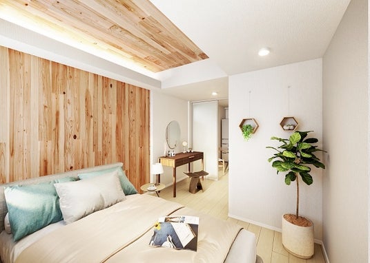 間取りは全住戸1LDKで、洋室部分の壁と天井には、本物の木の質感が感じられるCLTのあらわしを設けています。