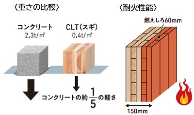 CLTはコンクリートよりも断熱性が高いのが特徴です。さらにCLTは、コンクリートよりも約1/5軽く、曲げ強度(破壊されるまで荷重をかけたときの強さ)はコンクリートよりも強いため、建物を軽量化しながら優れた耐震性を実現することができます。