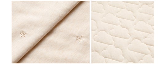 ブランケットにはスター柄の刺繍が、BOXパッドのキルティングは雲の形で、可愛らしいアクセントをあしらっています。カラーはベージュとグレーの2色をご用意しております。
