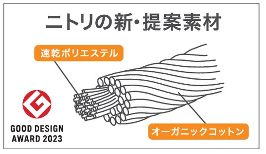 本シリーズは、天然素材ならではのやさしい肌触りと、汗をかいてもさらりと快適な吸湿性を兼ね備えており、2023年グッドデザイン賞を受賞した「ニトリ独自の新素材」を採用しています。