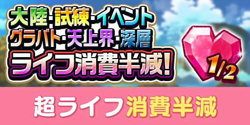 期間中、大陸・試練・イベント・グランバトル・天上界NORMAL・現代大陸深層・アリーナクエストで消費するライフが半減されます。